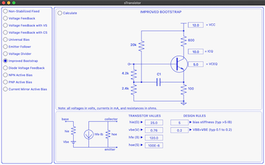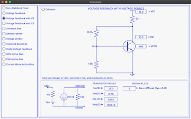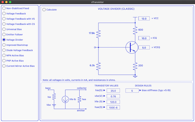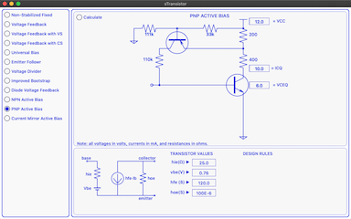 sTransistor is a utility to aid DC biasing transistor amplifiers. It enables the user to switch between twelve of the most common passive and active DC bias configurations and then synthesize a resistor network to support the desired bias state. sTransistor supports a transistor small signal model conditions in calculating the bias conditions. In addition, when appropriate, the bias stiffness can be varied.